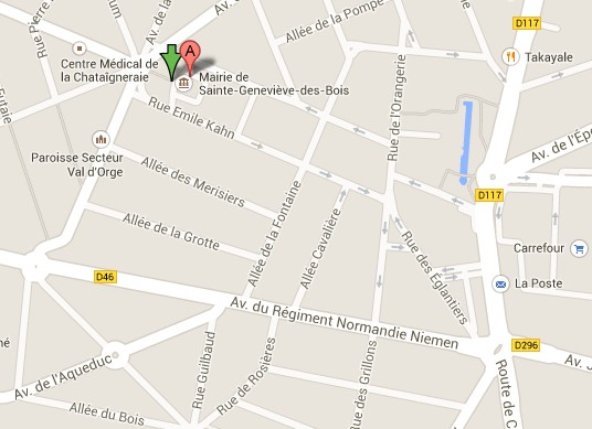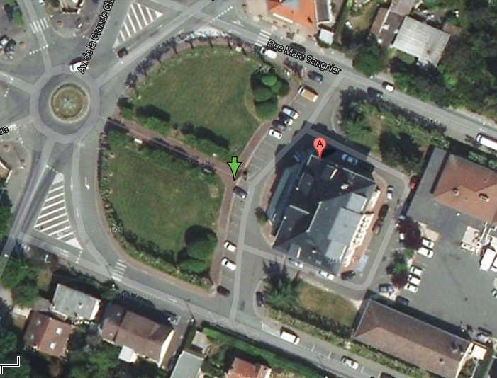le bâtiment de lHôtel de Ville et ses allées (A) le parking est repéré par la flêche verte. Notre barnum ny est pas visible mais cest bien ici le lieu du rendez-vous.